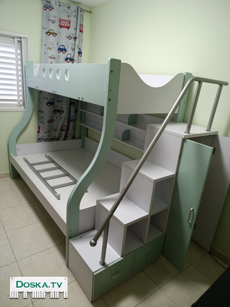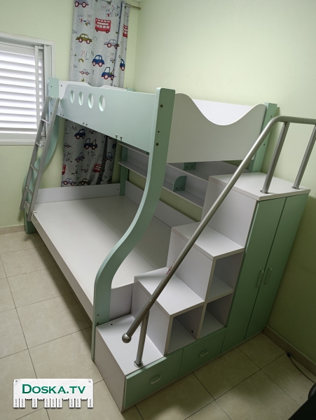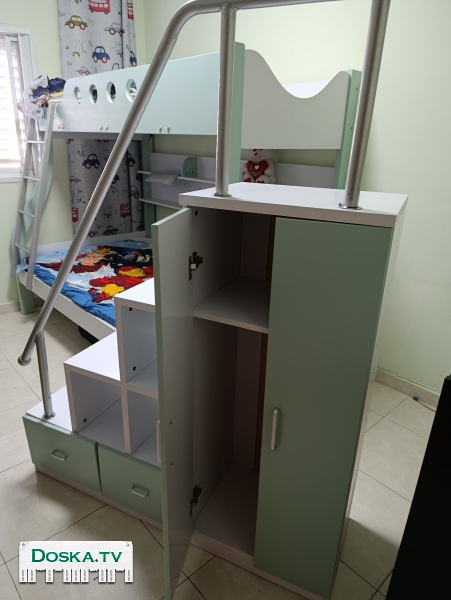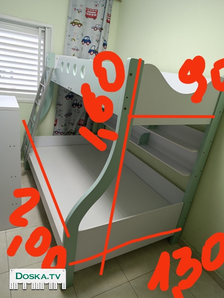 Продам двухъярусную детскую кровать, нижний ярус полтора спальная, верхний одна спальная кровать. .. Куплена новой и собрана один раз. Без матрасов. Плюс лестница с шкафчиком. .. 1600 шек.
