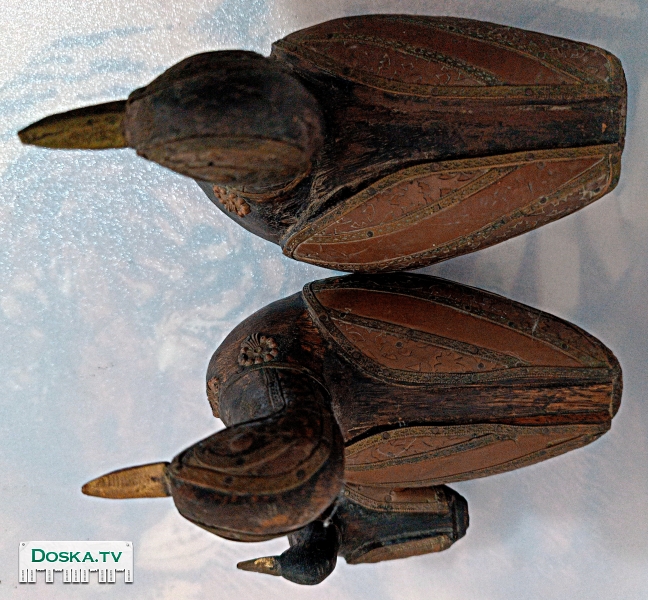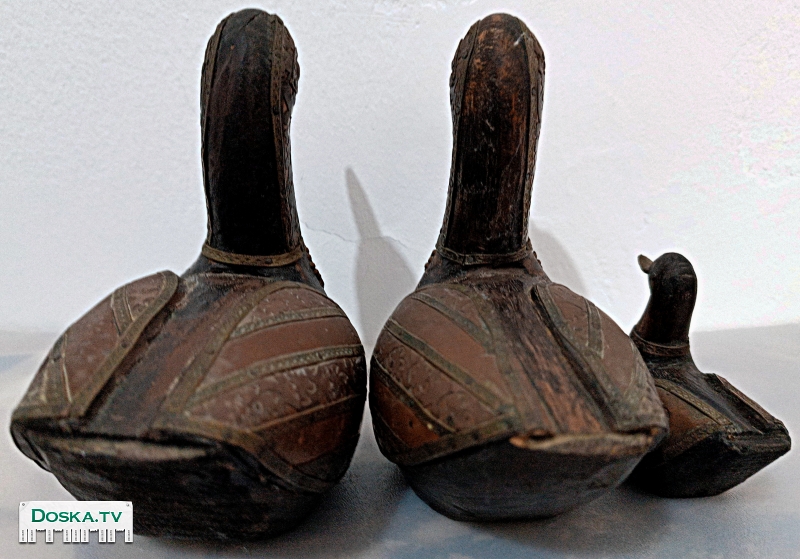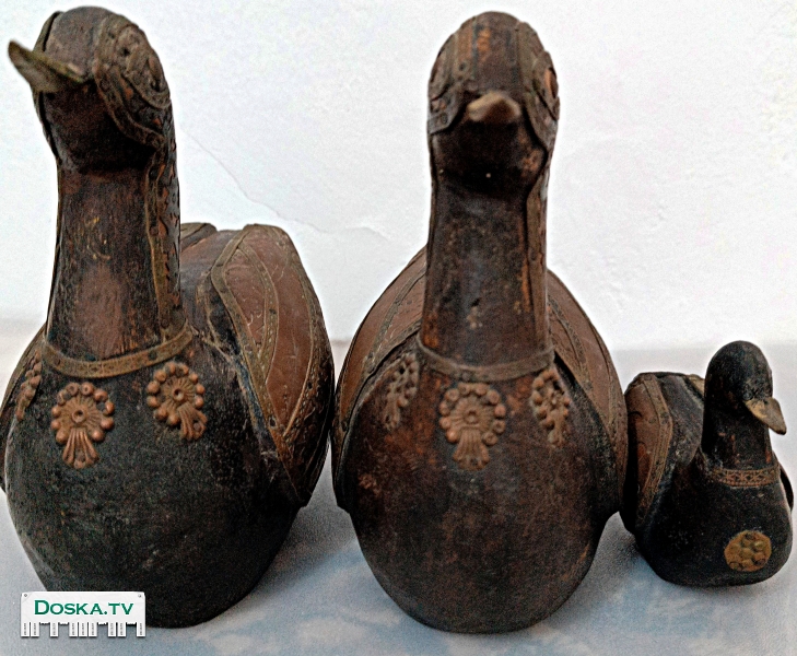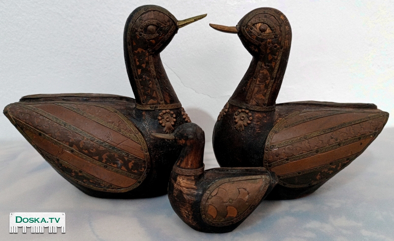 Коллекционные фигурки из дерева, изображающие семейство уток (селезень, утка и утенок), покрытые медью, могут быть очень красивым украшением или коллекционным предметом. Они могут иметь медный цвет и детально проработанные особенности, такие как крылья, шея, голова и медный клюв. Такие фигурки могут быть созданы мастерами-резчиками из дерева и покрыты медью для придания им особого вида и блеска.